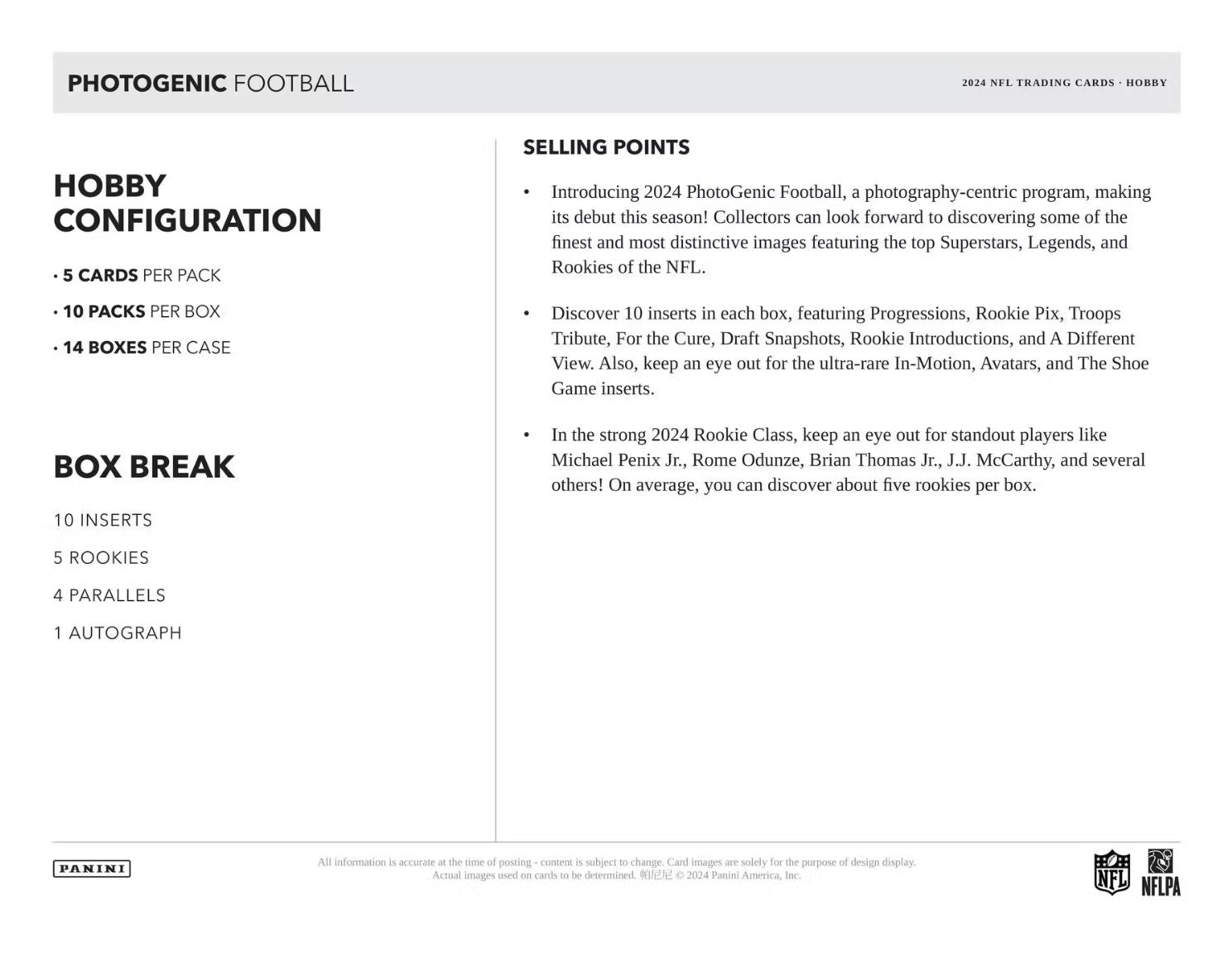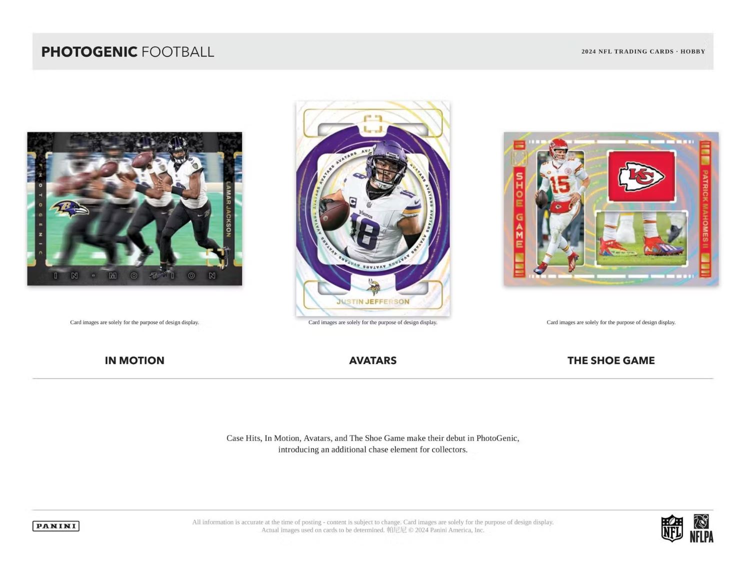 Introducing 2024 PhotoGenic Football, a photography-centric program, making its debut this season! Collectors can look forward to discovering some of the finest and most distinctive images featuring the top Superstars, Legends, and Rookies of the NFL.