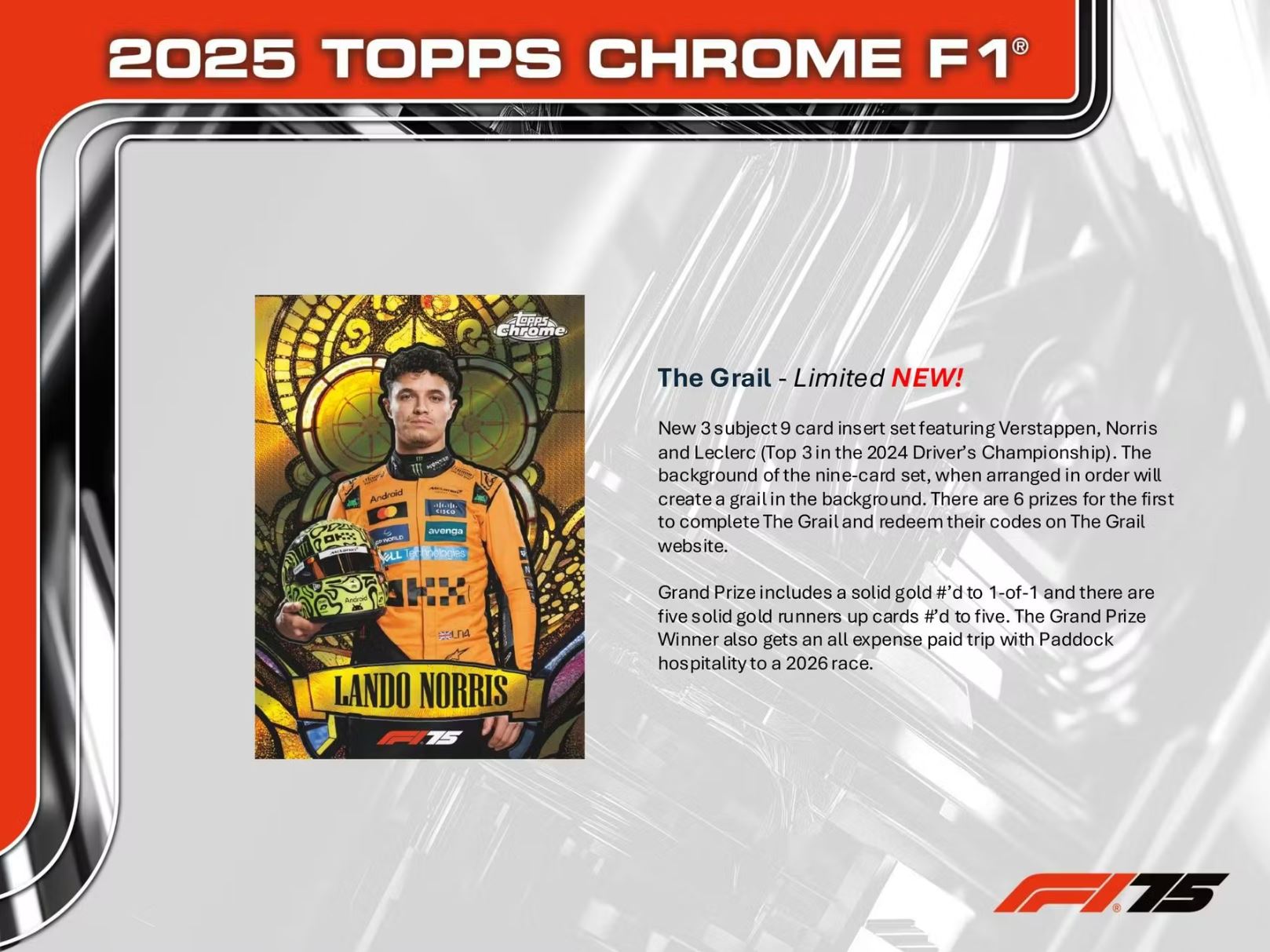New 3 subject 9 card insert set featuring Verstappen, Norris and Leclerc (Top 3 in the 2024 Driver's Championship). The background of the nine-card set, when arranged in order will create a grail in the background. There are 6 prizes for the first to complete The Grail and redeem their codes on The Grail website.