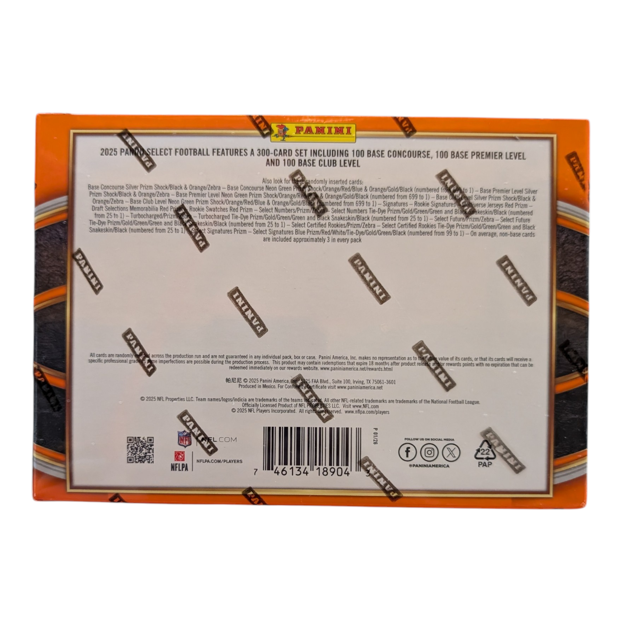 Select Football returns in 2025 with a massive five-tiered, 500-card base set that grows increasingly more rare with each tier. Also find a fantastic insert lineup that magnificently blends the best players of the past with the biggest stars of today.