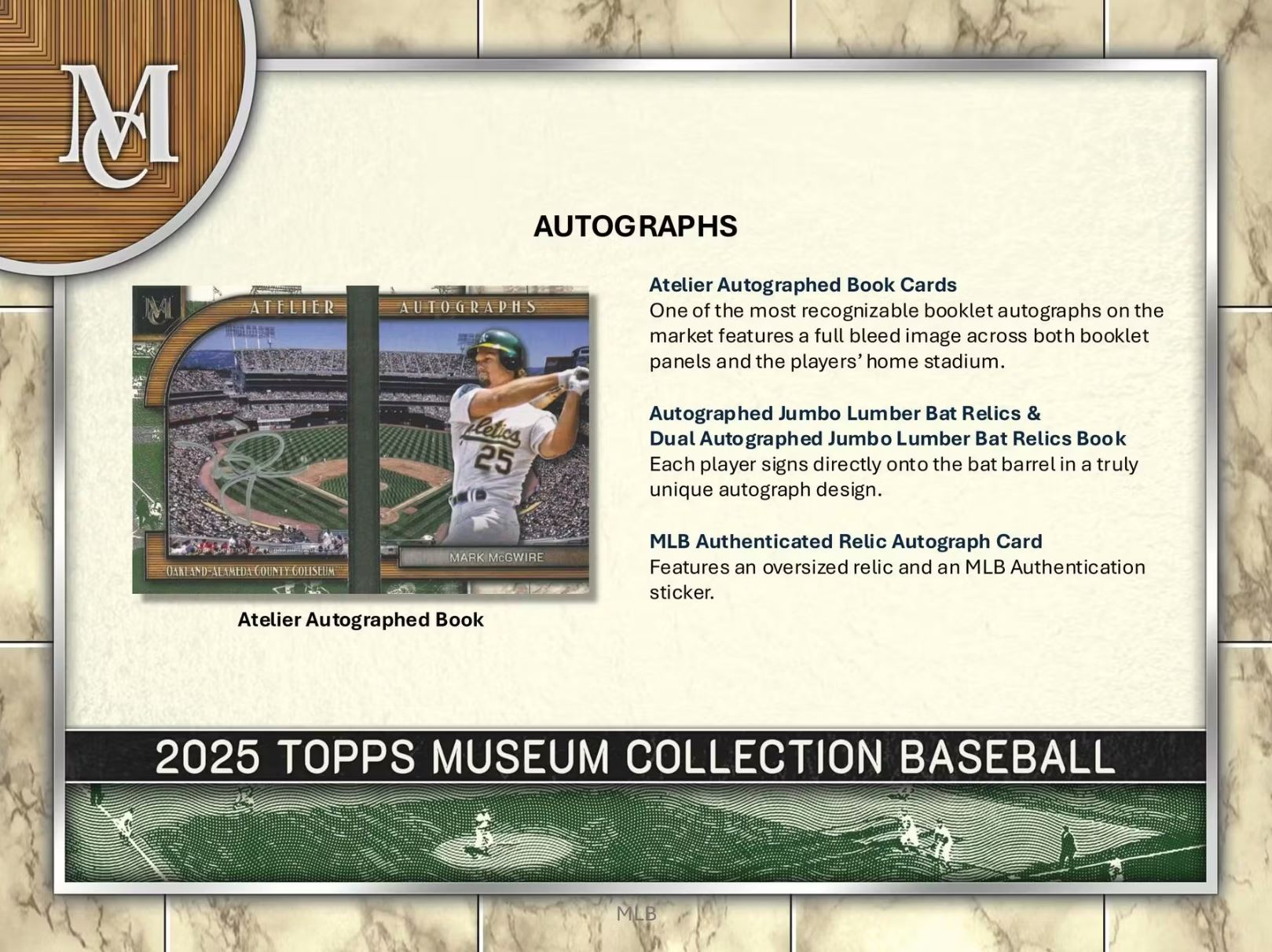 Museum Collection offers collectors a wide range of autograph cards on striking new designs! Look for the return of Archival Autographs, Museum Framed Autographs, Atelier Autographed Books, Momentous Material Jumbo Patch Autographs, MLB Authenticated Autograph Relics and more!