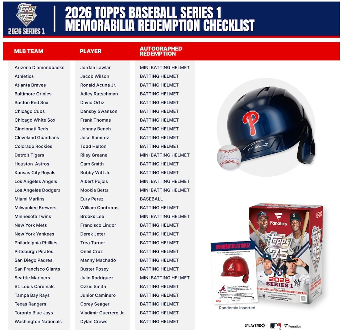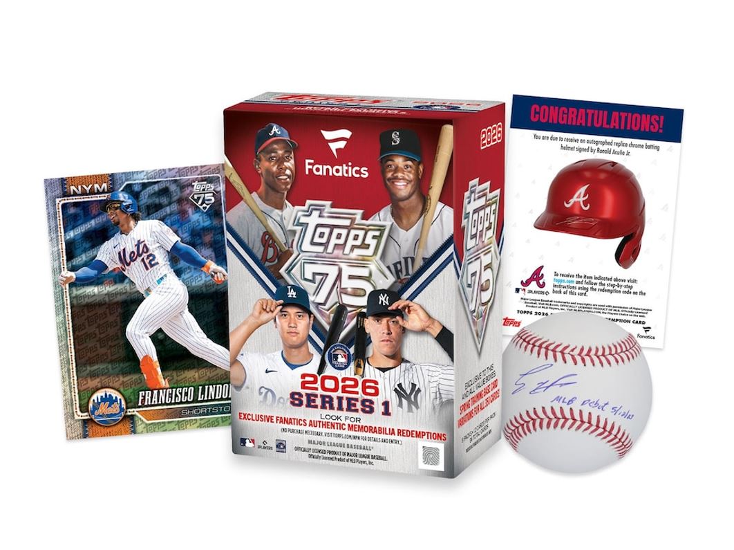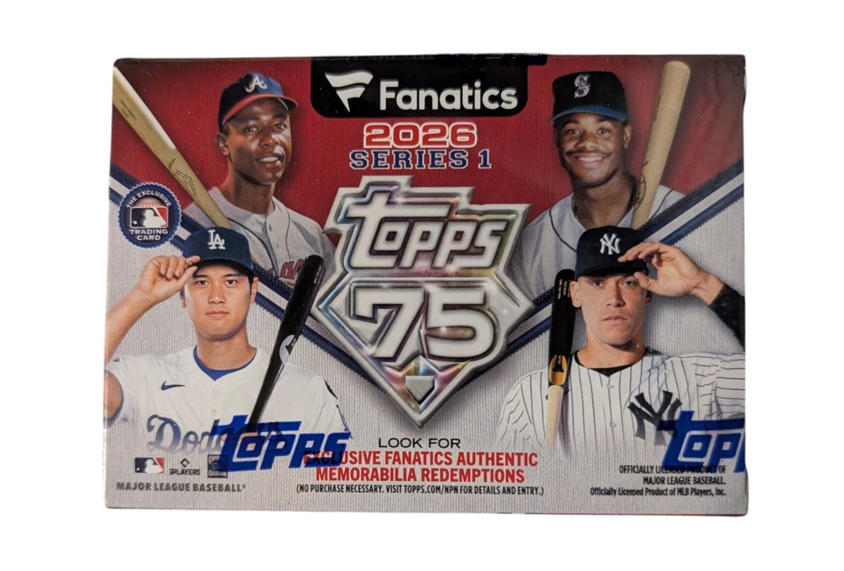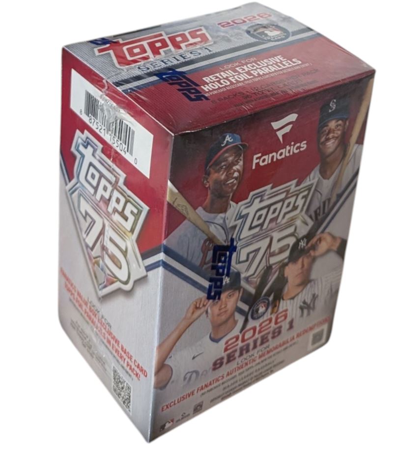 Celebrate the 75th anniversary of Topps Baseball with 2026 Series 1. Collectors will find the league's current stars, greats from the past, and rising rookies featured on base cards, inserts, and autograph and relic cards.