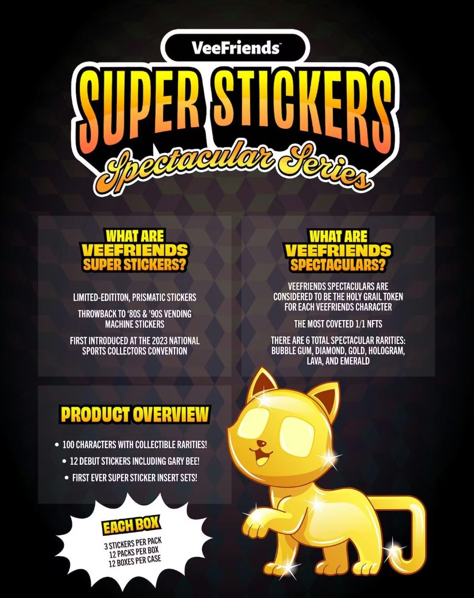 First introduced in May 2021 with VeeFriends Series 1, Spectaculars are ultra-rare 1-of-1 tokens that represent the pinnacle of collectibility in the VeeFriends universe. Featured in six rare types -Bubble Gum, Diamond, Gold, Hologram, Lava, and Emerald- they've become the "holy grail" for each character. Super Stickers: Spectacular Series brings the Spectacular rarity beyond NFTs and into the hands of collectors everywhere with six dazzling foil treatments across 100 characters to collect (including 88 returning characters & 12 debut characters).