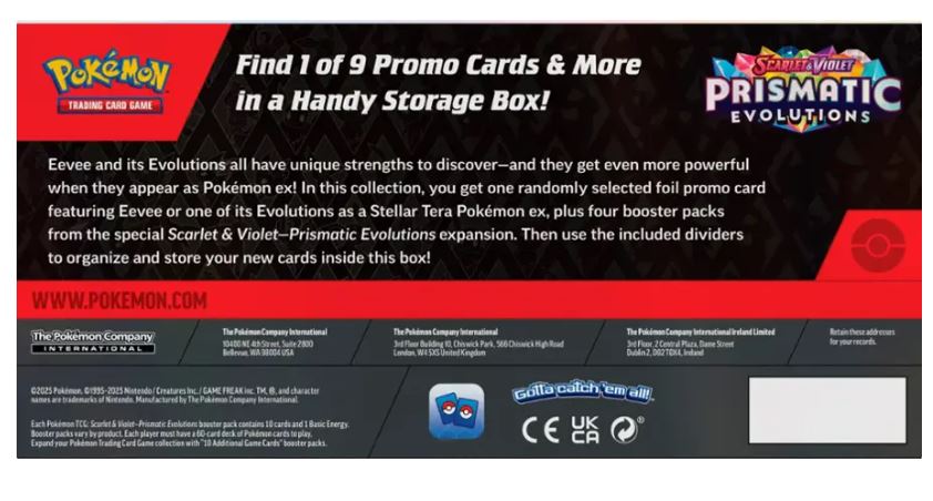 Find 1 of 9 Promo Cards and more in a Handy Storage Box! Eevee and its Evolutions all have unique strengths to discover—and they get even more powerful when they appear as Pokémon ex! In this collection, you get one randomly selected foil promo card featuring Eevee or one of its Evolutions as a Stellar Tera Pokémon ex, plus four booster packs from the special Scarlet & Violet—Prismatic Evolutions expansion. Then use the included dividers to organize and store your new cards inside this box! Unwrap 1 of 9 special foil promo cards and a handful of Pokémon TCG booster packs!