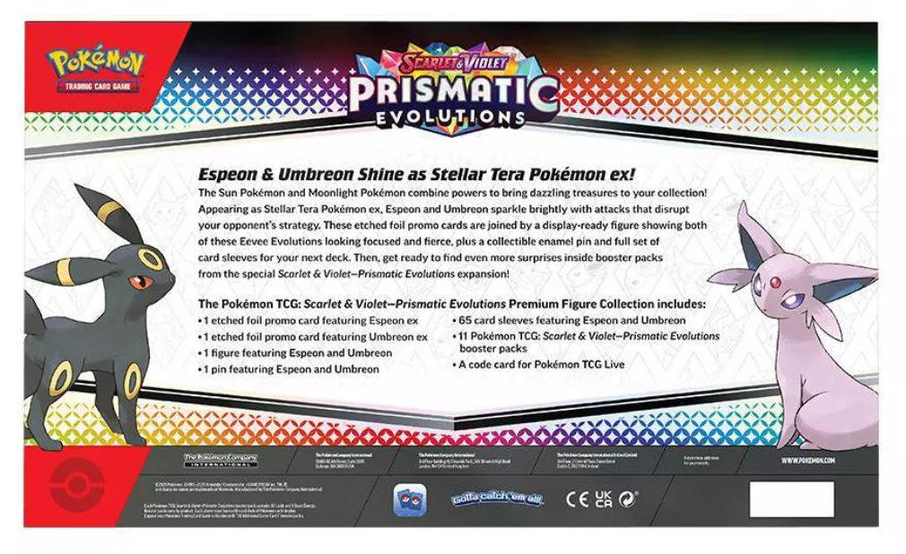 Espeon & Umbreon Shine as Stellar Tera Pokémon ex! The Sun Pokémon and Moonlight Pokémon combine powers to bring dazzling treasures to your collection! Appearing as Stellar Tera Pokémon ex, Espeon and Umbreon sparkle brightly with attacks that disrupt your opponent’s strategy. These etched foil promo cards are joined by a display-ready figure showing both of these Eevee Evolutions looking focused and fierce, plus a collectible enamel pin and full set of card sleeves for your next deck. Then, get ready to find even more surprises inside booster packs from the special Scarlet & Violet—Prismatic Evolutions expansion!