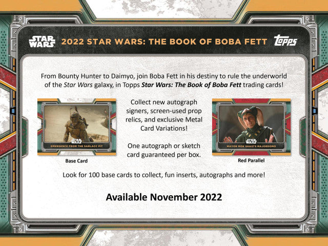Sourced Fabric Relic Cards – Sourced fabric from costume pieces of the The Book of Boba Fett cast. Hobby Exclusive!